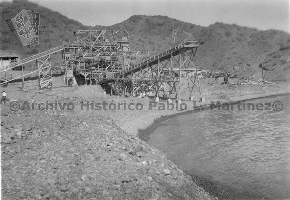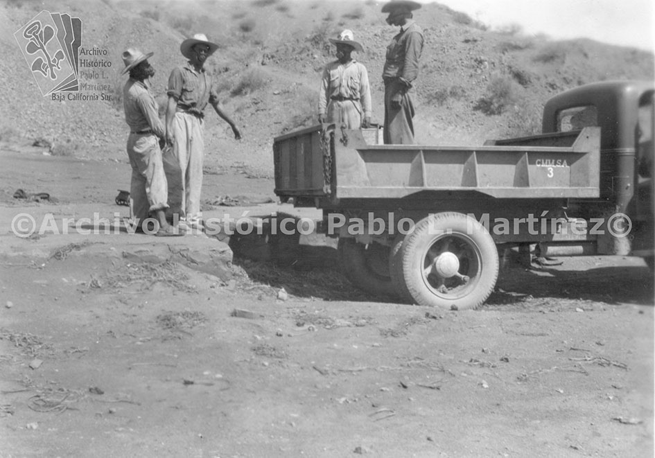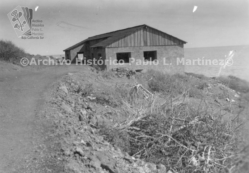 Nota. En una carpeta con el texto "8 fotografías de la inspección sanitaria de las minas de manganeso en Mulegé. Expediente 1255, caja 6, 3/3, año 1944". Nota. Fotografía perteneciente al expediente AGE, Compañía Mexicana de Manganeso. Relaciones entre la Compañía Mexicana de Manganeso S.A. de Mulegé y sus trabajadores. Número de catálogo 331.1/1255, número de inventario 685/00, septiembre 29 de 1944, caja 6 3/3. Nota, Al reverso, 1 La construcción.