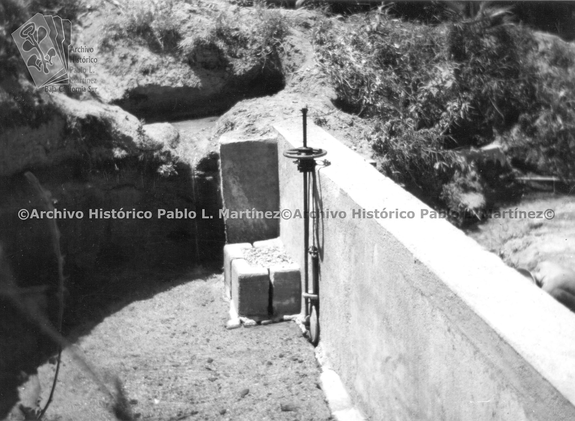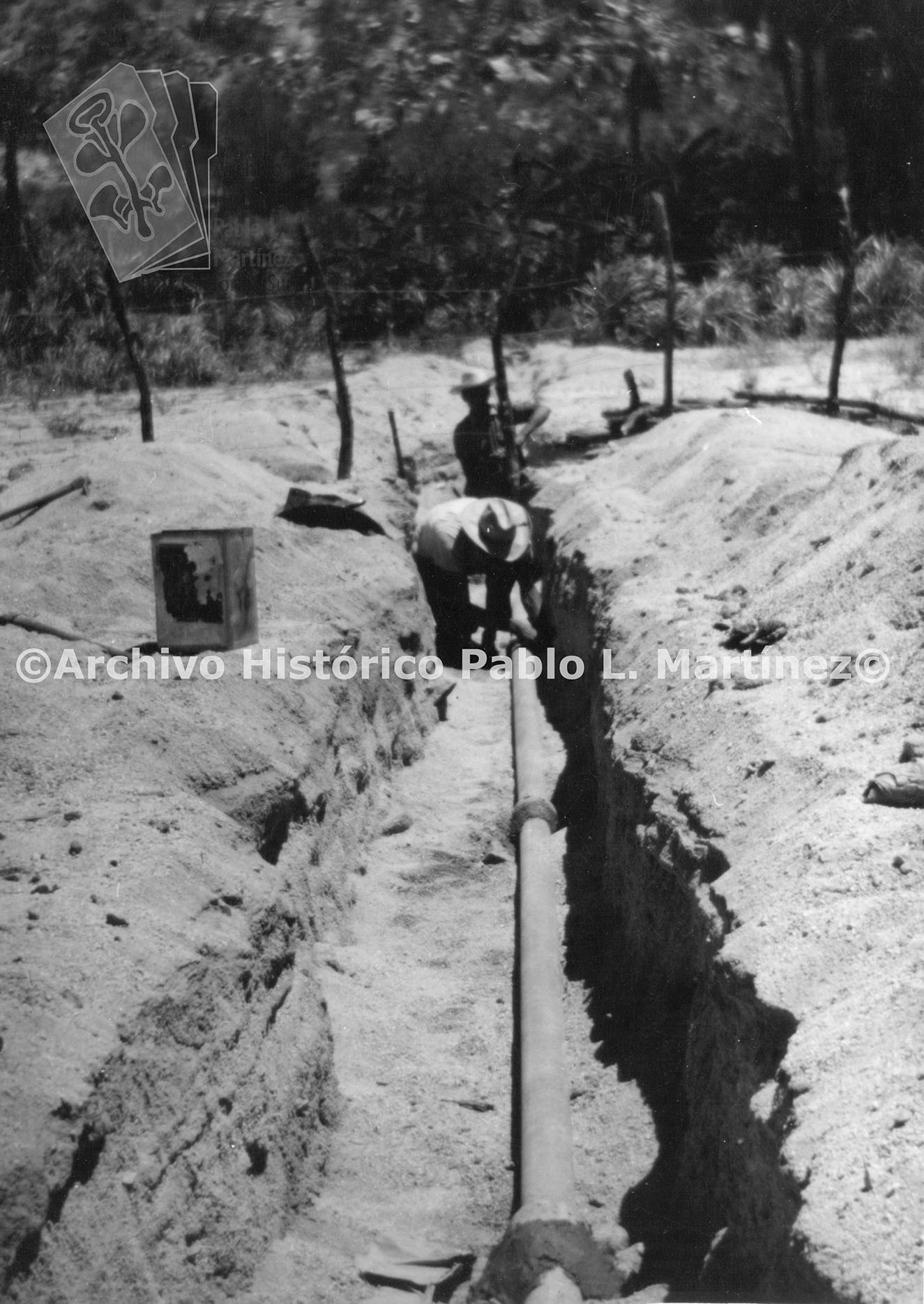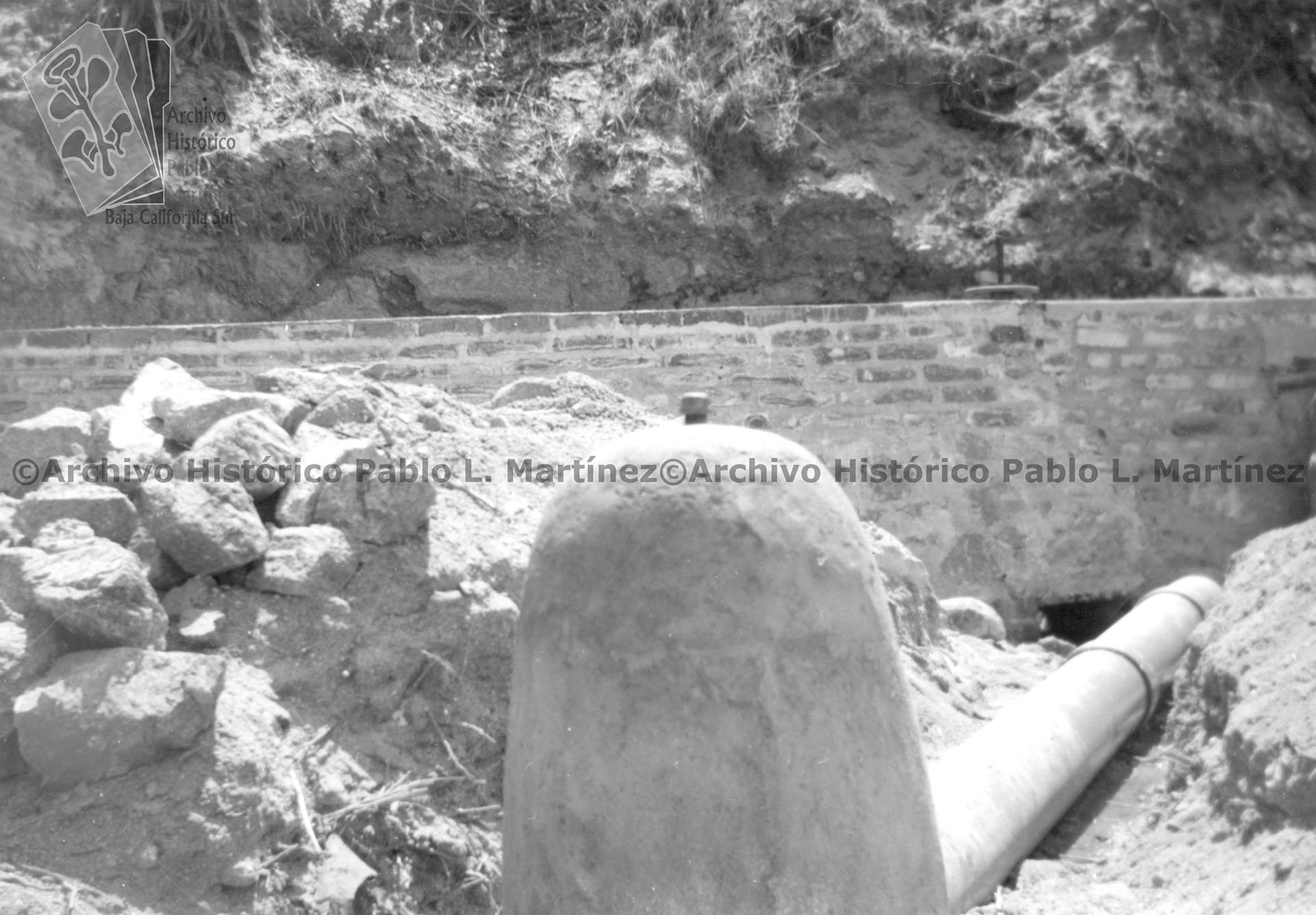 Nota. En una carpeta con el texto "Datos de localización. Vol. 271. AGE-1987 s/ Exp. 11 fotografías sueltas blanco y negro s/ la instalación de la tubería de agua potable en San Bartolo., B. C. 14 de mayo de 1962" Nota. Al reverso, Instalación de agua potable en San Bartolo, B. C. 11.- Equipo que se ha hecho cargo de las instalaciones. 14 de mayo de 1962.