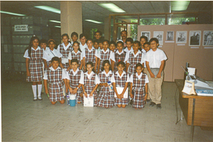 Pegada a una hoja con el texto: "Alumnos de primaria visitando la exposición de Hidalgo, en el Archivo Histórico Pablo L. Martínez"